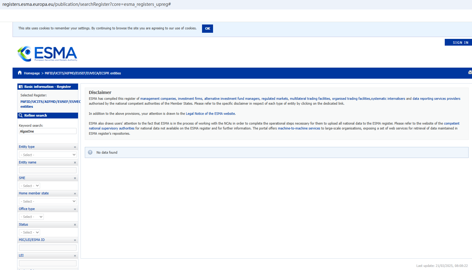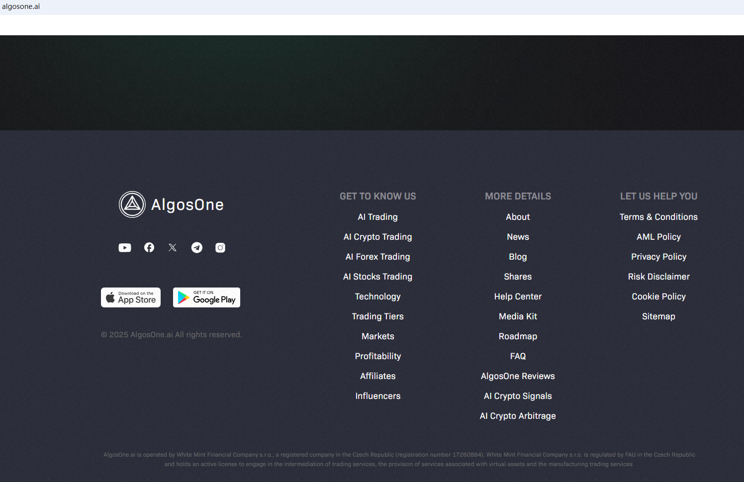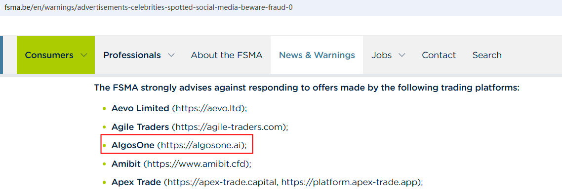 On March 19, 2025, the Financial Services and Markets Authority (FSMA) issued a warning about AlgosOne for the lack of the required authorization. https://www.fsma.be/en/warnings/advertisements-celebrities-spotted-social-media-beware-fraud-0