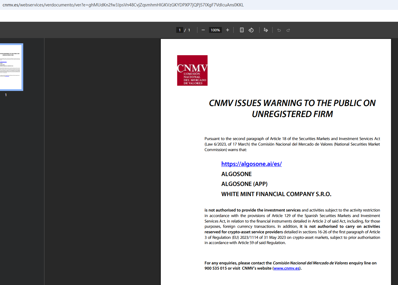 On July 14, 2025, the National Securities Market Commission (CNMV) issued a warning against AlgosOne, believing this company might be providing financial services or products without proper authorization. https://www.cnmv.es/webservices/verdocumento/ver?e=ghMUdKn2fw3JpsVn48CvjZqsmhmHlGKVzGKYDPXP7jQPj57IXgF7VdIcuAns0KKL