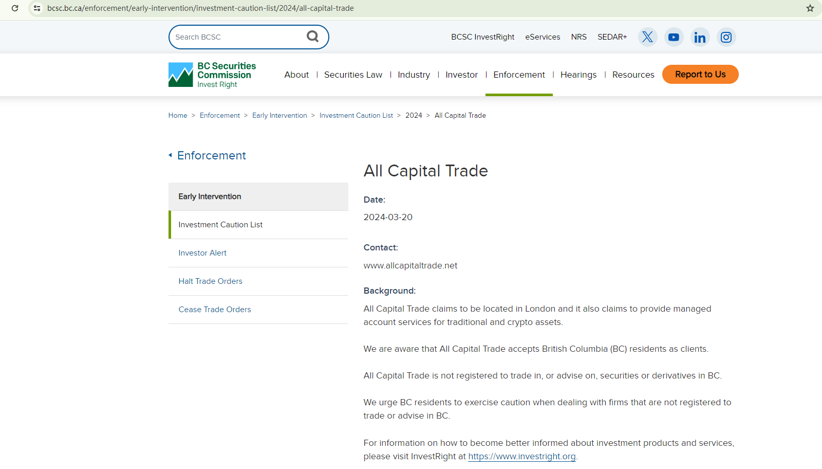 On March 20, 2024, the British Columbia Securities Commission (BCSC) issued a warning against All Capital Trade, stating that this broker is not registered to trade in, or advise on, securities or derivatives in BC. https://www.bcsc.bc.ca/enforcement/early-intervention/investment-caution-list/2024/all-capital-trade