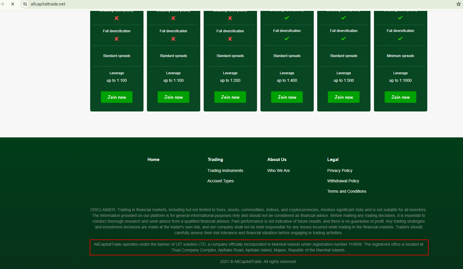 While All Capital Trade claims to be managed by UIT solution LTD, a company supposedly registered with the Marshall Islands Registry (IRI), it is crucial to note that the agency only serves as a corporate registry service provider. Registration with the IRI doesn't authorize the entity to legally operate in the specific industry. This is a red flag.