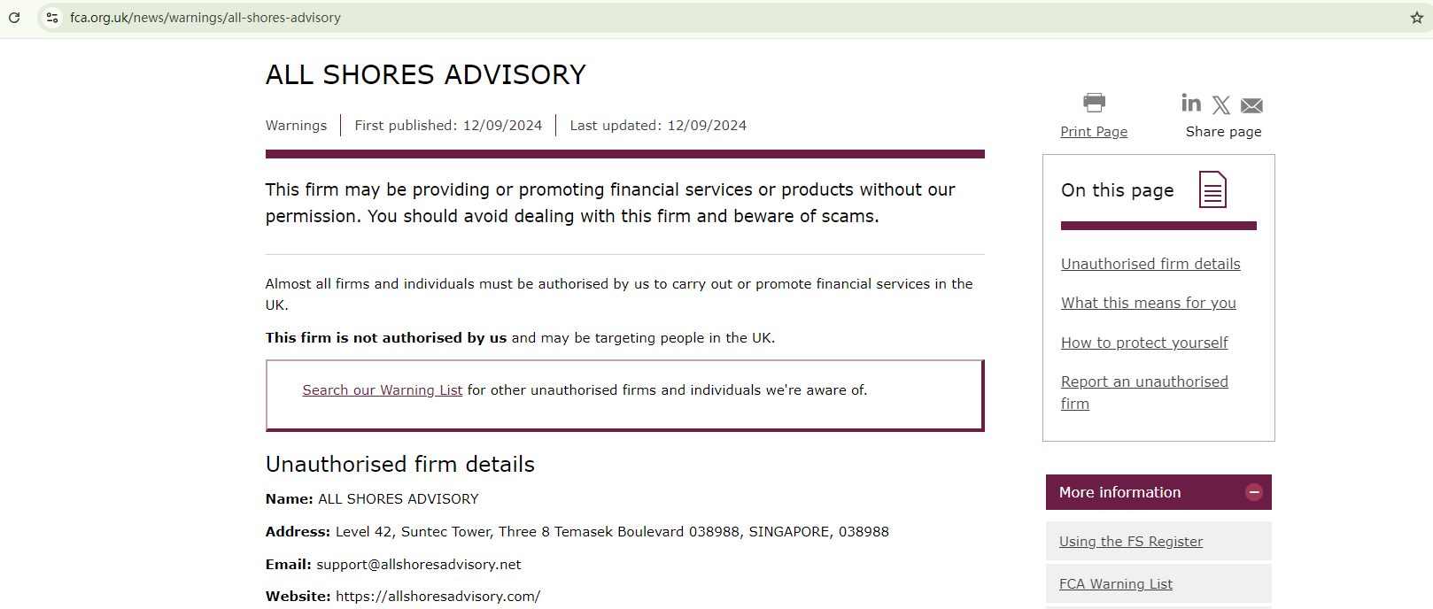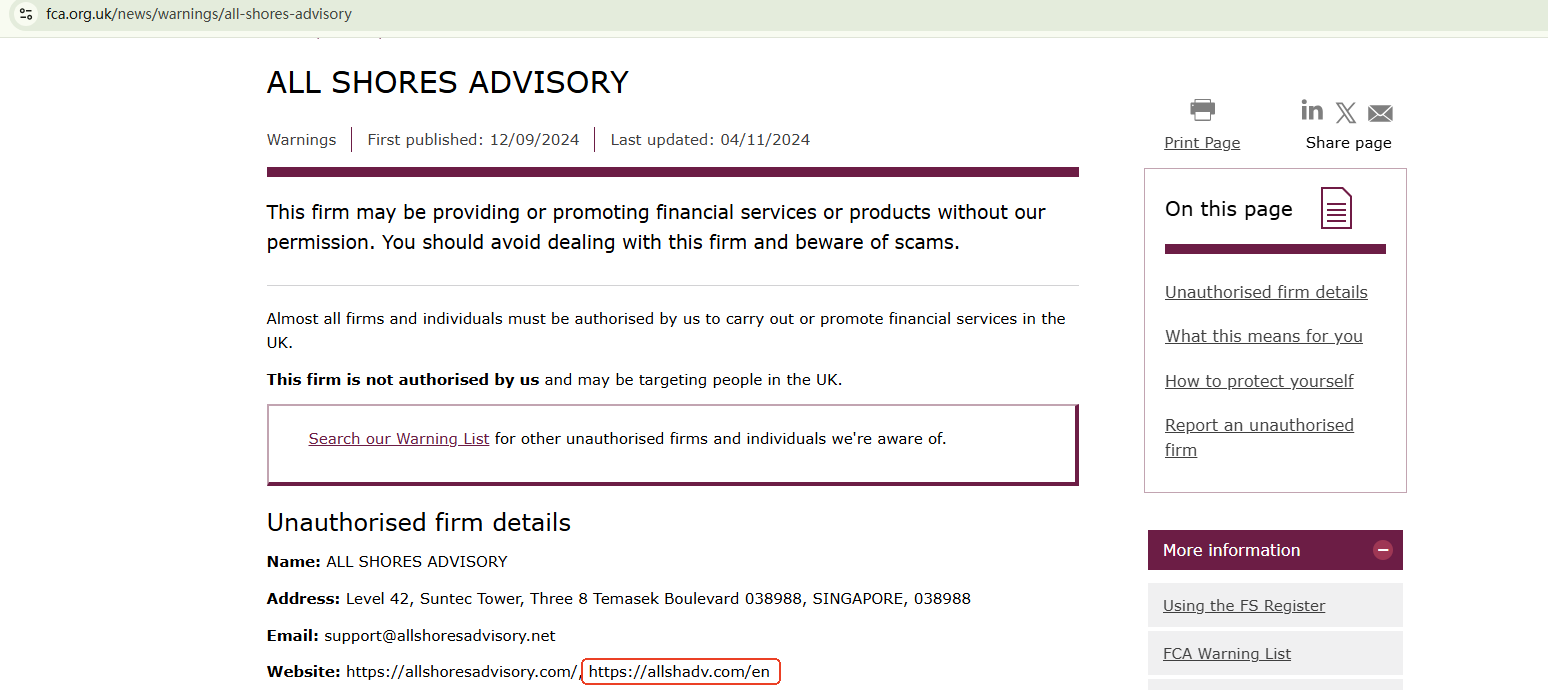 In addition, the Financial Conduct Authority (FCA) has issued a warning against ALL SHORES ADVISORY for the lack of the required authorization.
