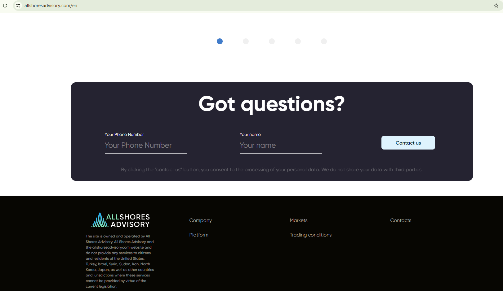 The previous website of ALL SHORES ADVISORY, allshoresadvisory.com, was detected by the Financial Conduct Authority (FCA) and marked as a potential scam. This website has since been deactivated. The FCA has found that ALL SHORES ADVISORY has relocated their business to a new domain, allshadv.com, and has updated the warning against this unauthorized firm. Investors should be informed and stay vigilant. https://www.fca.org.uk/news/warnings/all-shores-advisory