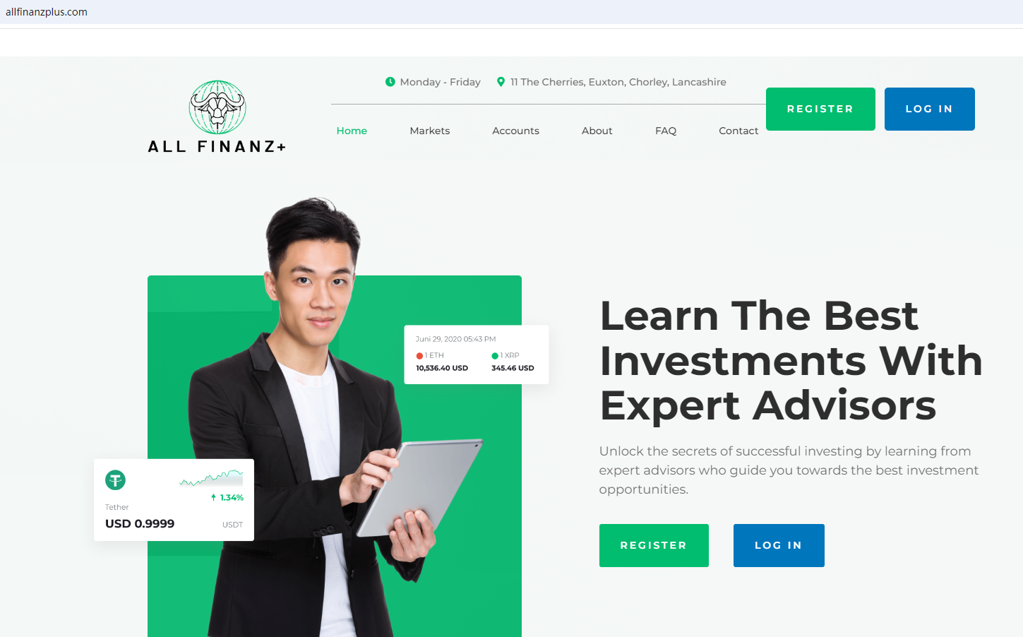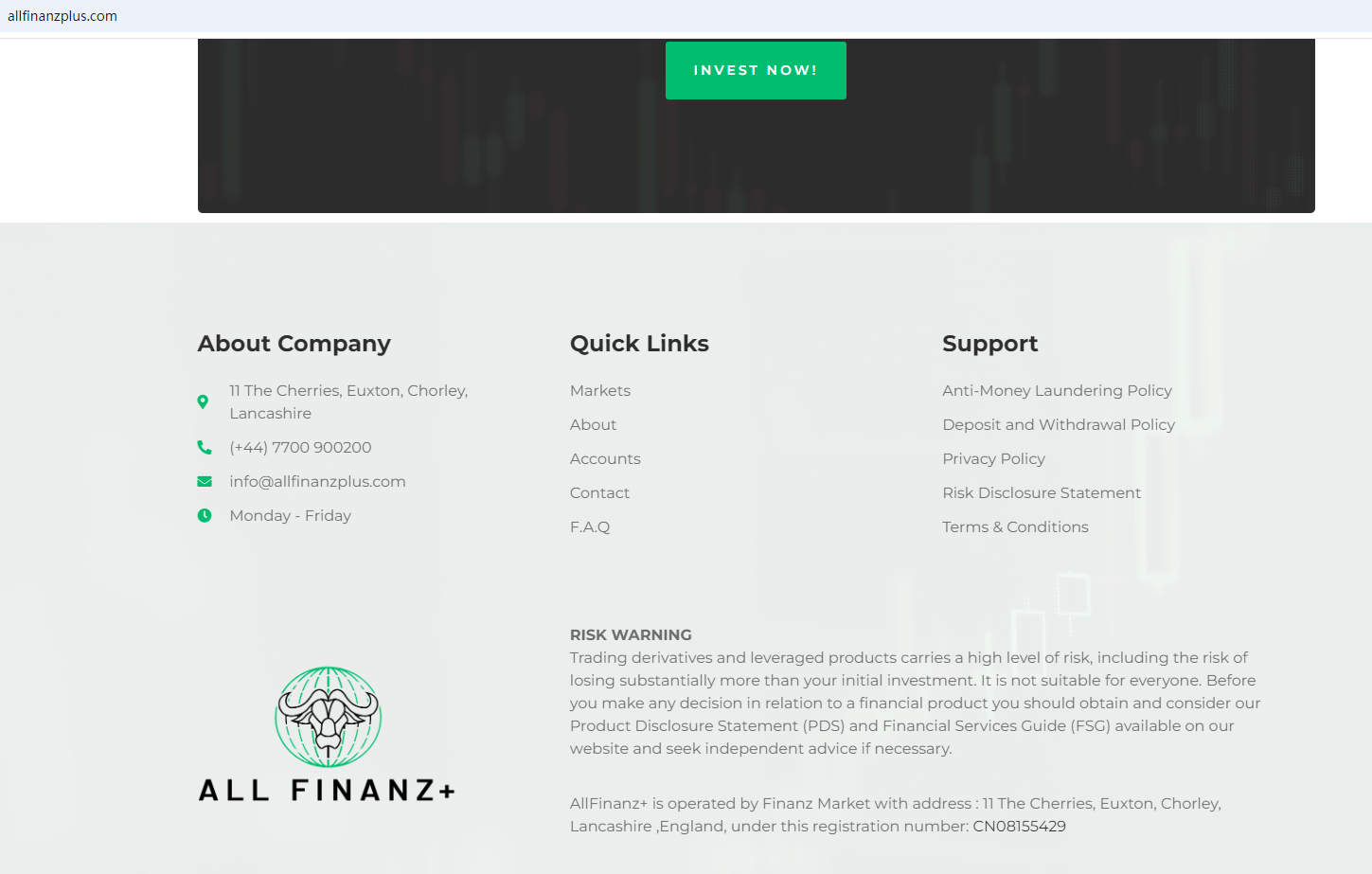 AllFinanz+ claims to be operated by Finanz Market registered in the UK under the registration number: CN08155429, offering a range of investment products to traders, including Forex, Indexes, Stocks, Cryptocurrencies and more instruments for trading in global markets.