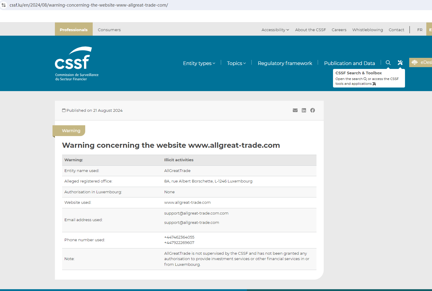 In addition, the Commission de Surveillance du Secteur Financier (CSSF) issued a warning about the fraudulent activities carried out by the entity AllGreatTrade.