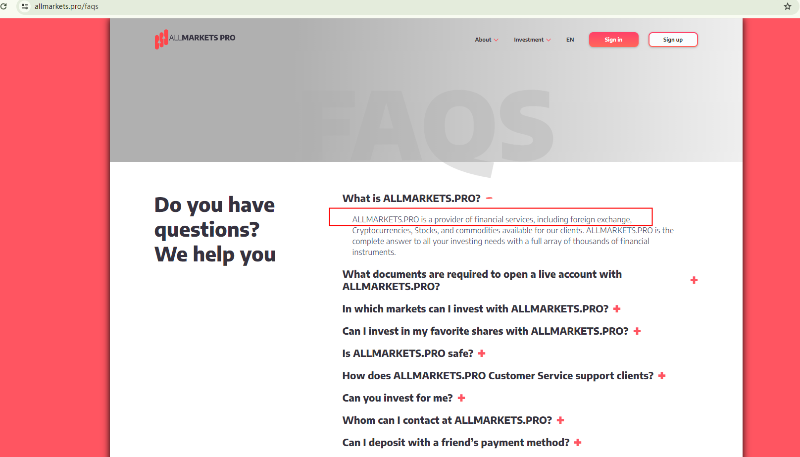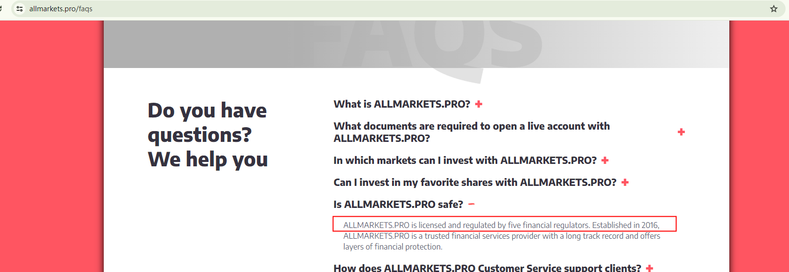 The truth is that ALLMARKETS PRO is not regulated by any regulators. Letting it hold or control investors' money is unsafe, and the money can not be protected by any laws.