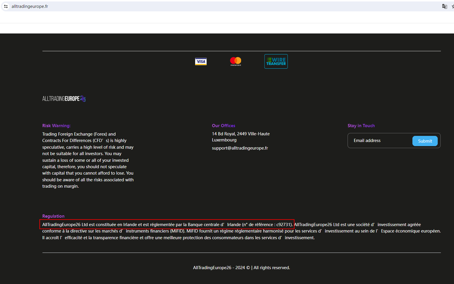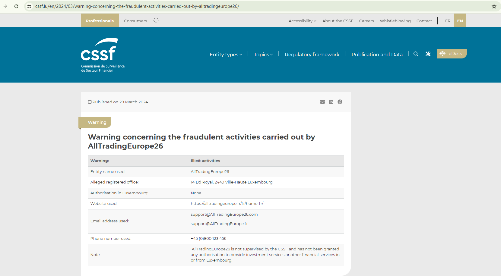 On March 29, 2024, the Commission de Surveillance du Secteur Financier (CSSF) issued a warning about AlltradingEurope26, stating that AllTradingEurope26 is not supervised by the CSSF and has not been granted any authorization to provide investment services or other financial services in or from Luxembourg. https://www.cssf.lu/en/2024/03/warning-concerning-the-fraudulent-activities-carried-out-by-alltradingeurope26/