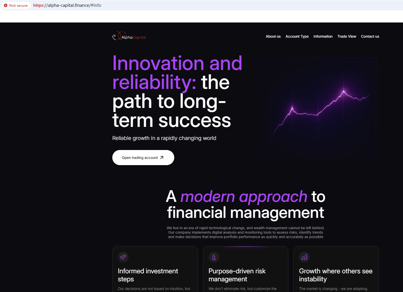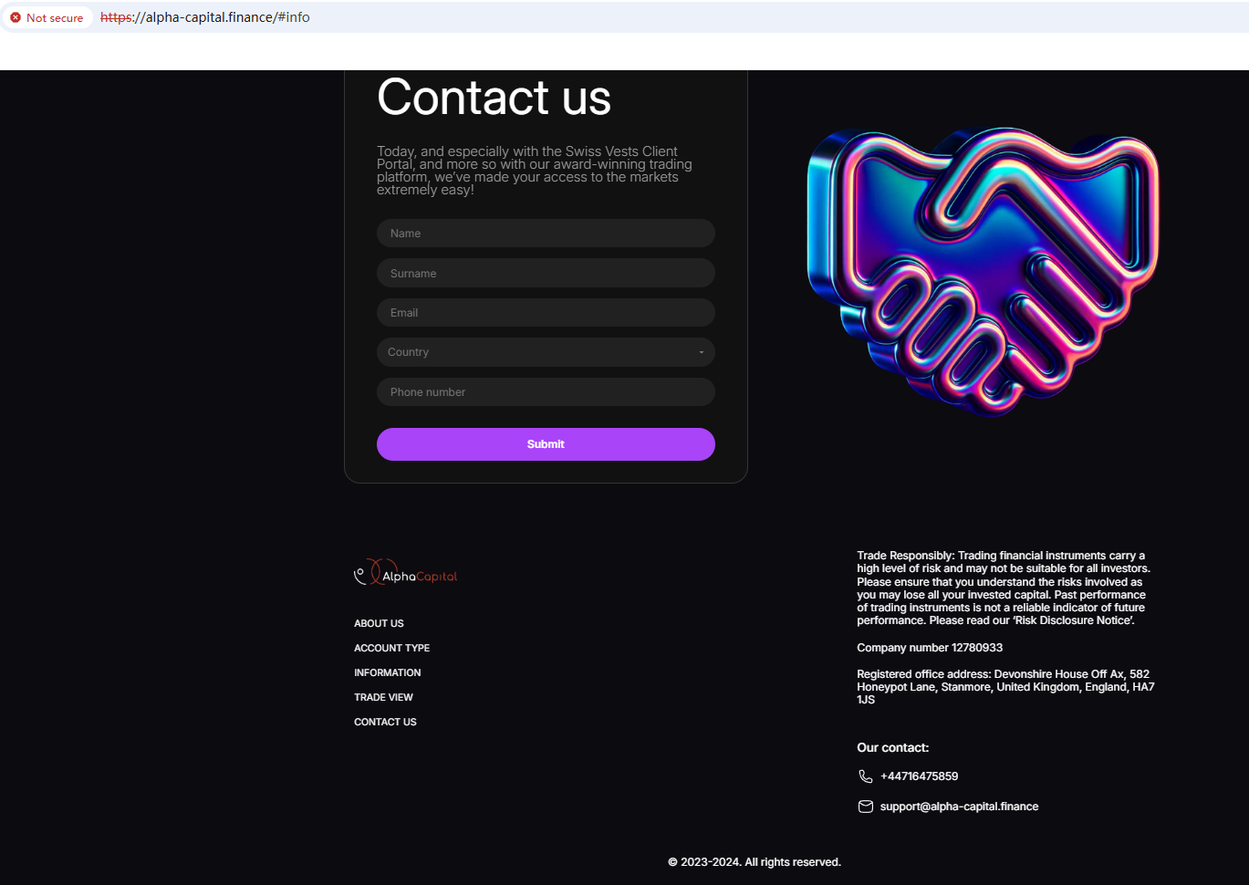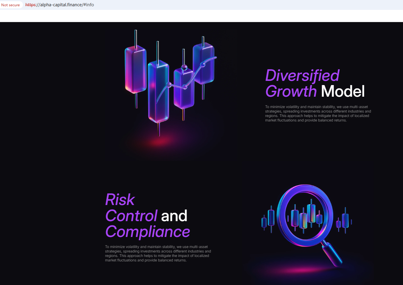 According to its website, it is located in the UK. Upon investigation, no matching information was found in the Financial Conduct Authority (FCA). In addition, the Italian Companies and Exchange Commission (CONSOB) ordered Alpha Capital to be blacklisted for offering financial services illegally in Italy.