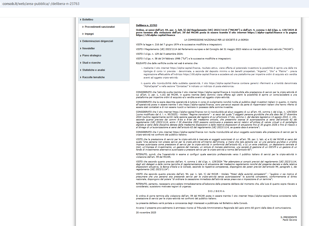 On Nov 20, 2025, the Italian Companies and Exchange Commission (CONSOB) ordered Alpha Capital to be blacklisted for offering financial services illegally in Italy. https://www.consob.it/web/area-pubblica/-/delibera-n-23763
