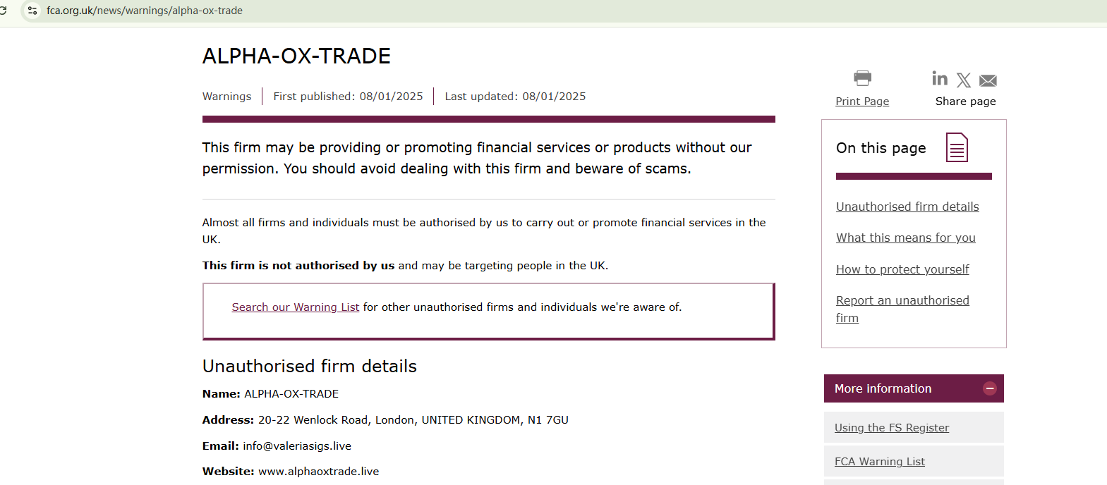ALPHA OX TRADE claims to be domiciled in the UK, but provides a physical address commonly associated with fraudulent trading platforms. Therefore, the operators behind ALPHA OX TRADE are unknown, as they conceal information about their identity. This is a red flag. In addition, the Financial Conduct Authority (FCA) has issued a warning against ALPHA OX TRADE, advising investors to stay away from this unauthorized firm in the UK.