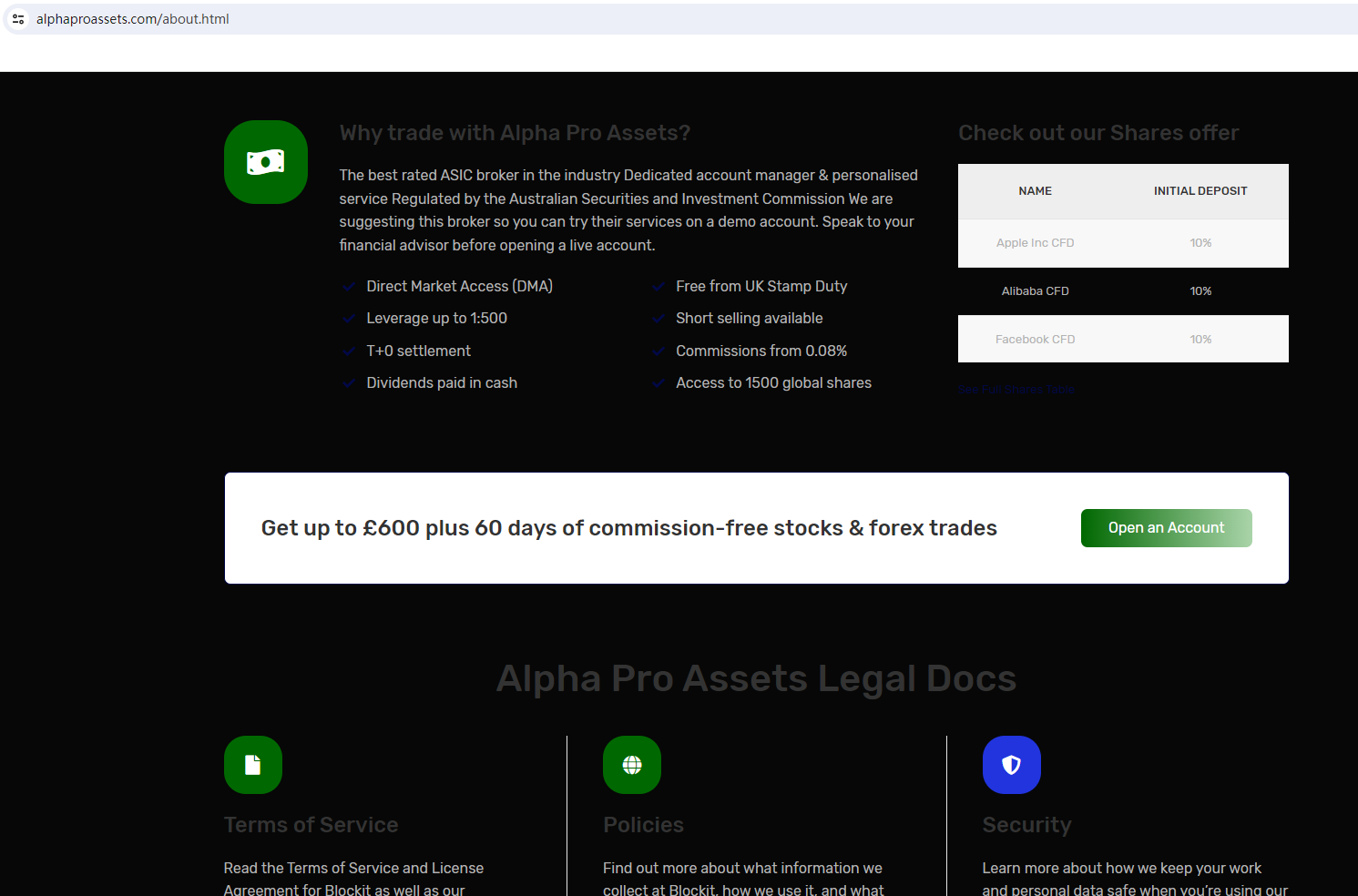 BrokersView found that the domain "https://www.alphaproassets.com/" is currently inaccessible. This is widely regarded as a significant red flag, as the suspension of a broker's website often points to underlying regulatory or operational issues.