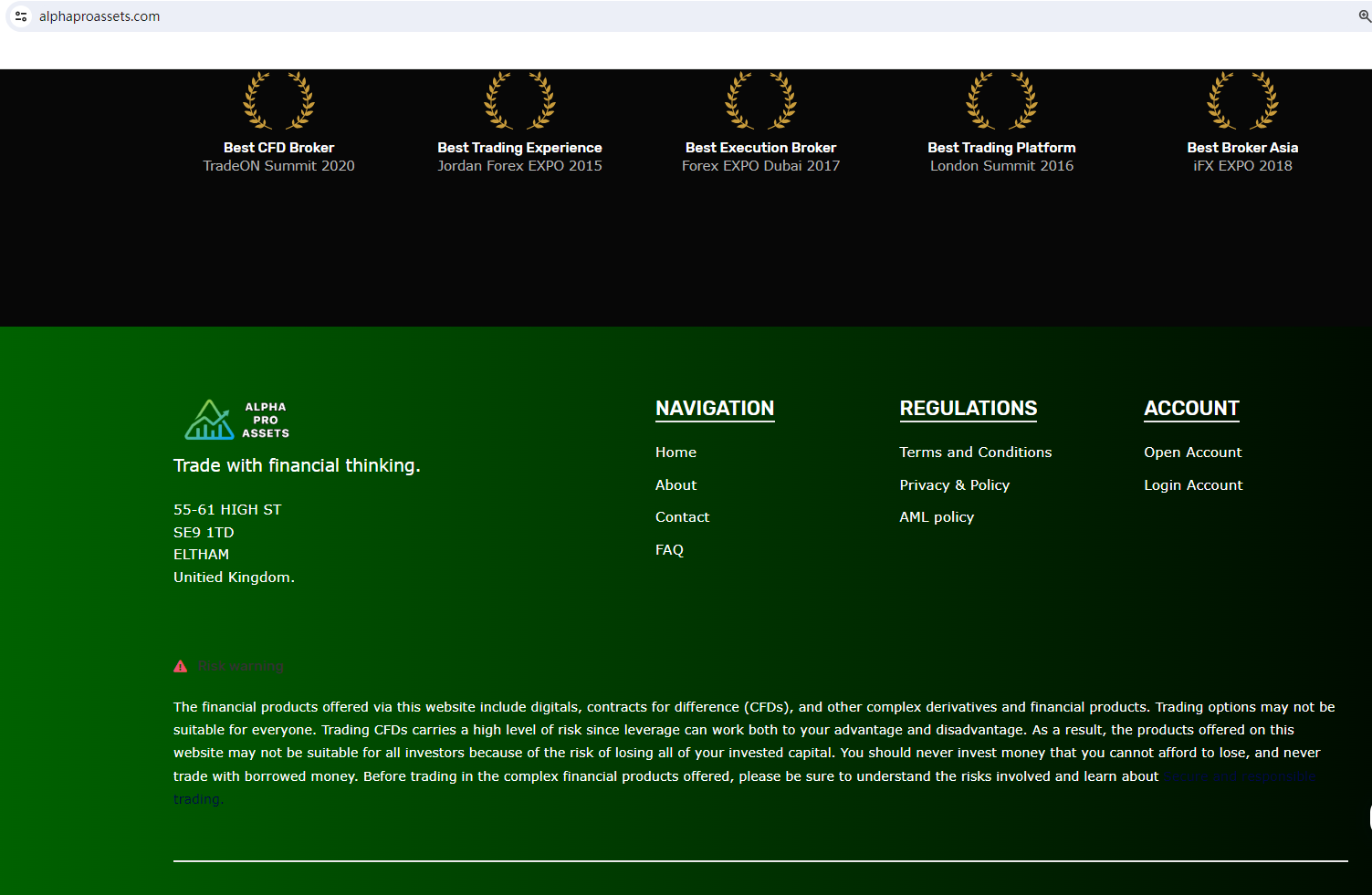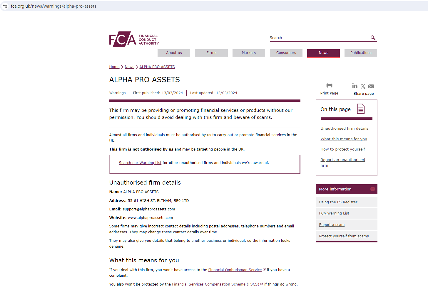 On 13 March 2024, the United Kingdom Financial Conduct Authority (FCA) issued a warning against Alpha Pro Assets, believing this company might be providing financial services or products without authorisation in the UK. You may visit: https://www.fca.org.uk/news/warnings/alpha-pro-assets