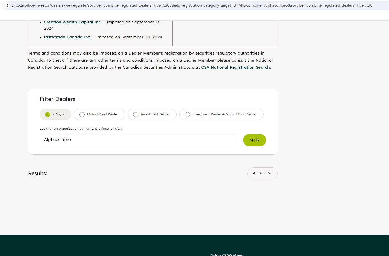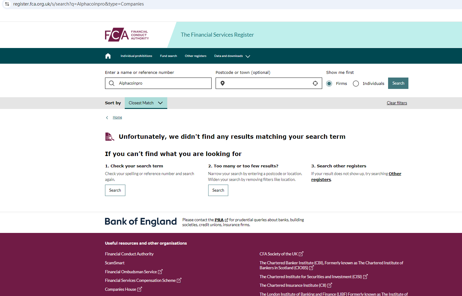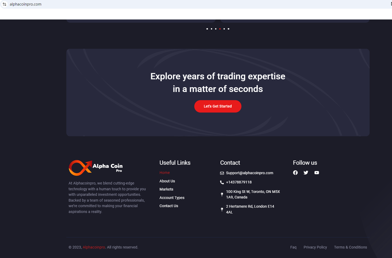 Alphacoinpro platform advertises having offices in Canada and London, UK. Upon investigation, no matching information was found in the Financial Conduct Authority (FCA) and Investment Industry Regulatory Organization of Canada (IIROC).