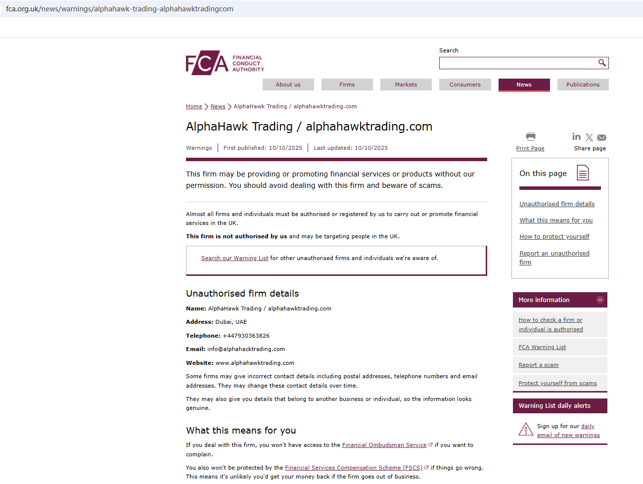 On Oct 10, 2025, the Financial Conduct Authority (FCA) issued a warning regarding AlphaHawk Trading, suspecting that this company may be offering financial services or products without the necessary authorization. https://www.fca.org.uk/news/warnings/alphahawk-trading-alphahawktradingcom