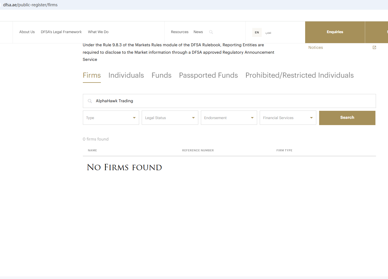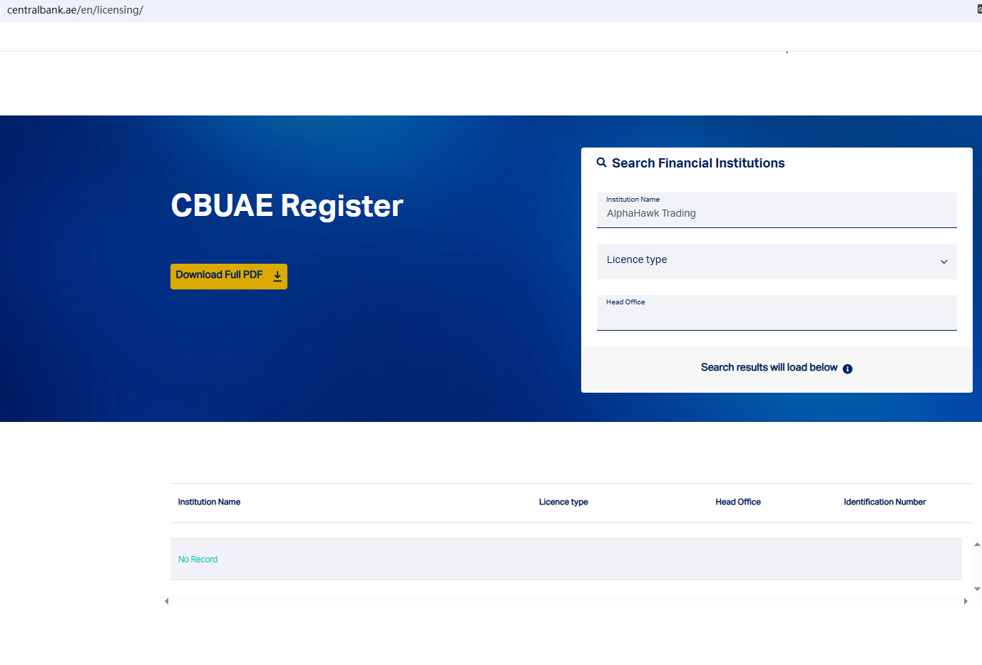 According to its website, it is located in the UAE. Upon investigation, no matching information was found in the Dubai Financial Services Authority (DFSA), Securities and Commodities Authority (SCA), Central Bank of the United Arab Emirates (CBUAE). In addition, the Financial Conduct Authority (FCA) issued a warning regarding AlphaHawk Trading, suspecting that this company may be offering financial services or products without the necessary authorization.