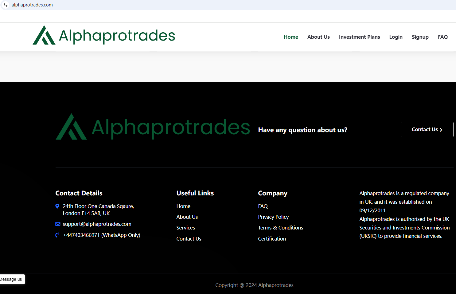 In essence, Alphaprotrades is not regulated by any governing body. Entrusting it with investors' funds is highly risky, as there are no legal protections in place to safeguard the funds.