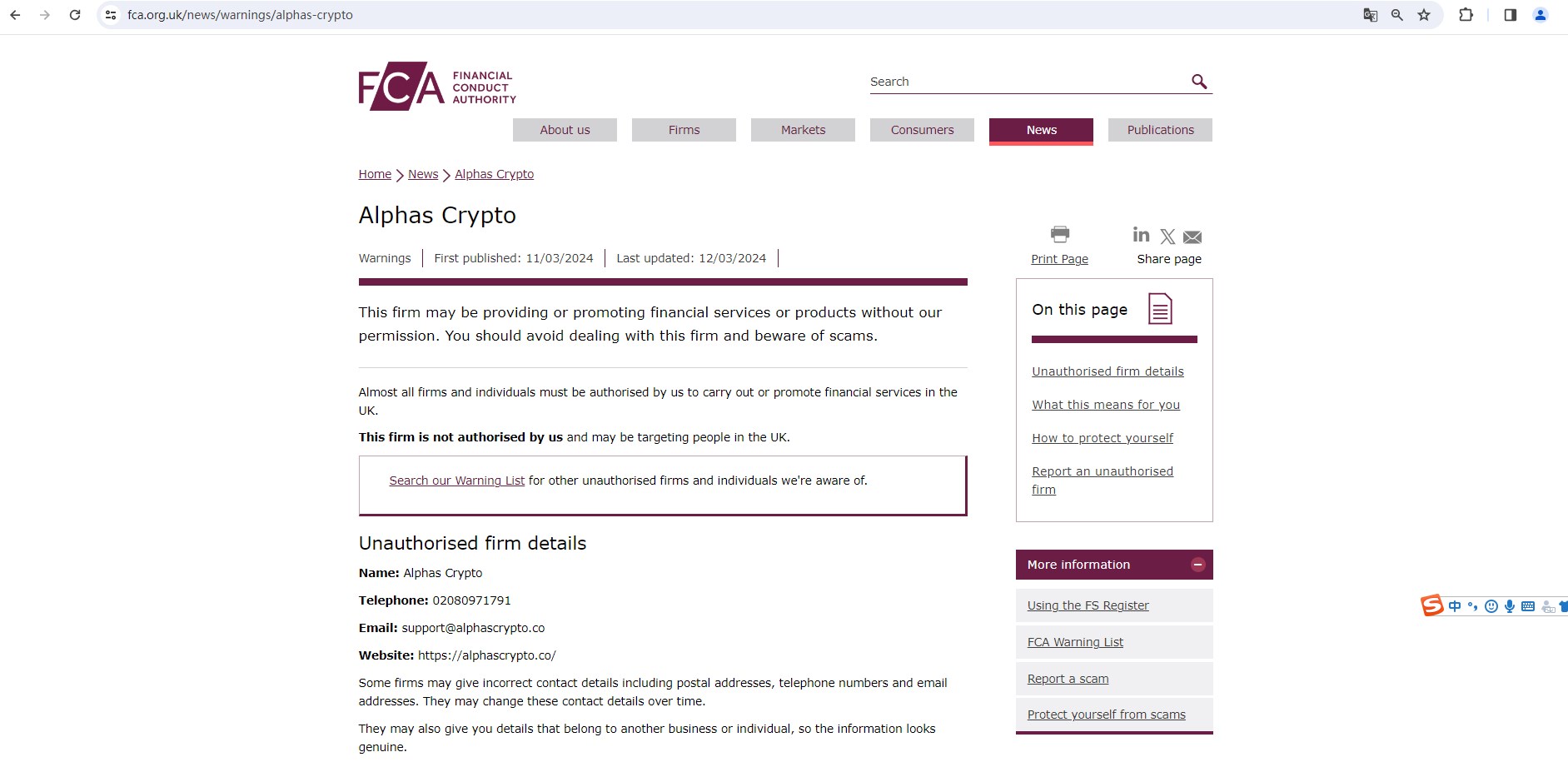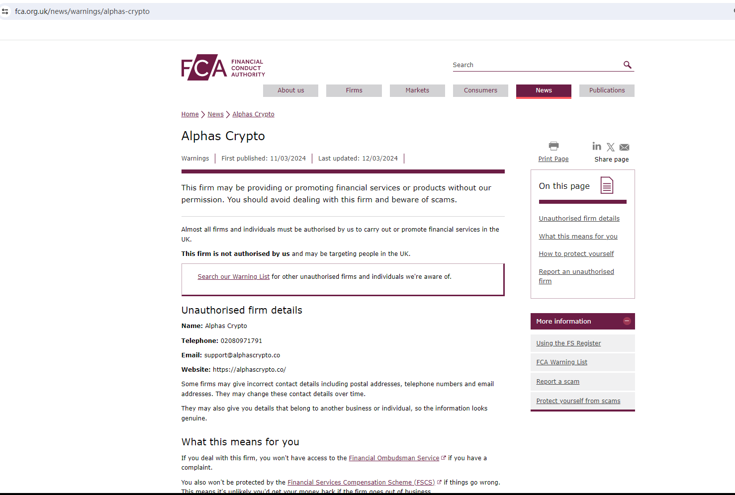 On 11 March 2024, the United Kingdom Financial Conduct Authority (FCA) issued a warning against Alphas Crypto, believing this company might be providing financial services or products without authorisation in the UK. You may visit: https://www.fca.org.uk/news/warnings/alphas-crypto.