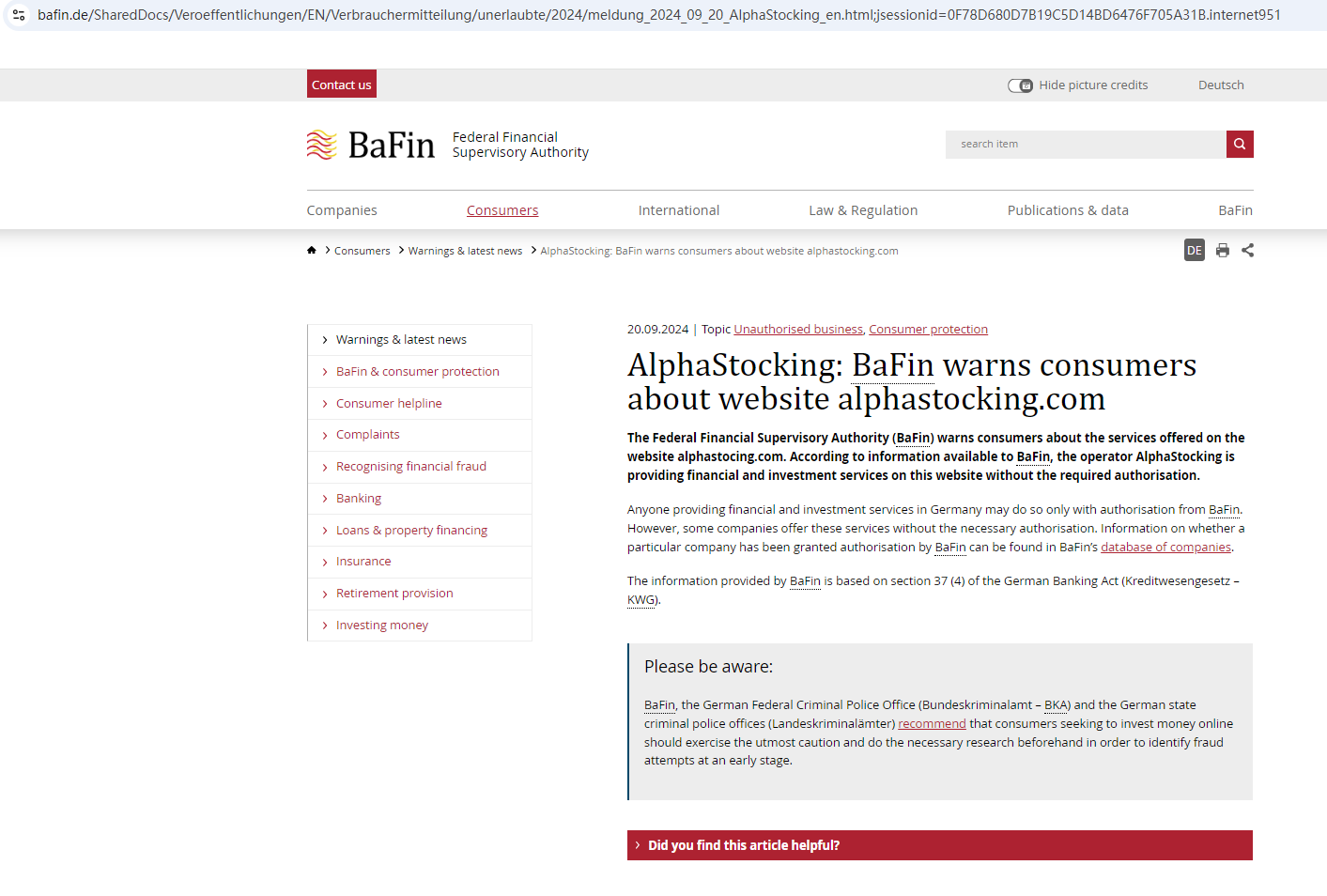 On September 20 2024, the Federal Financial Supervisory Authority (BaFin) warned consumers about the services offered by the company AlphaStocking (alphastocking.com), which is offering financial and investment services without the required authorization. https://www.bafin.de/SharedDocs/Veroeffentlichungen/EN/Verbrauchermitteilung/unerlaubte/2024/meldung_2024_09_20_AlphaStocking_en.html