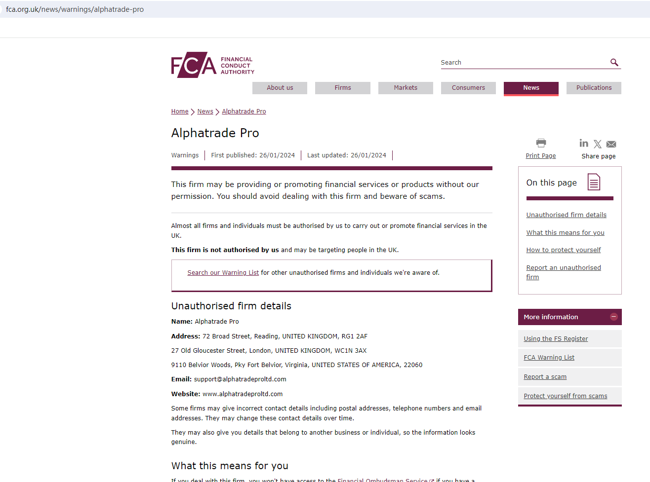 On January 26, 2024, the Financial Conduct Authority (FCA) issued a warning against Alphatrade Pro, believing this company might be providing financial services or products without proper authorization in the UK. https://www.fca.org.uk/news/warnings/alphatrade-pro