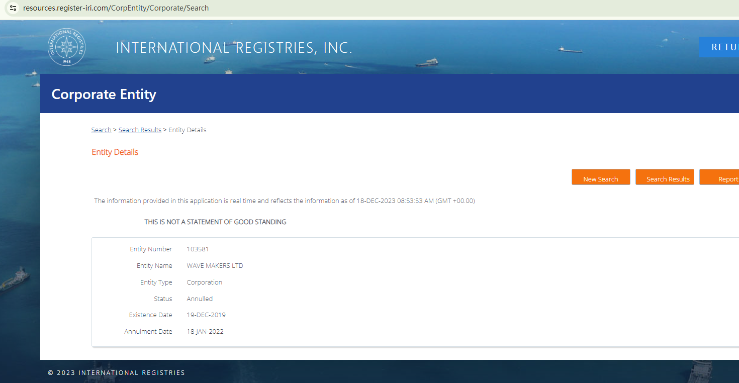 AlphaTradings provides information about its registration with the Marshall Islands Registry (IRI) in an attempt to appear legitimate. However, records from this privately held maritime and corporate registry service provider indicate that its registration has been canceled. This annulled registration, along with the lack of any other information about its regulatory status, is a significant indicator of potential fraud.