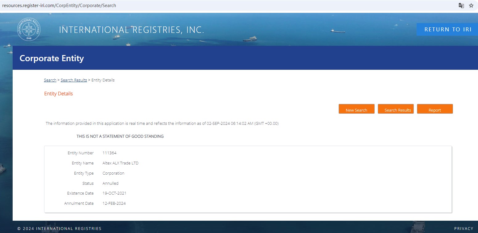 Upon investigation, we found that Altex ALX Trade LTD is registered with the INTERNATIONAL REGISTRIES, INC. (IRI) in Marshall Islands, an International Business Companies Registry that doesn't license forex trading brokerage activities.