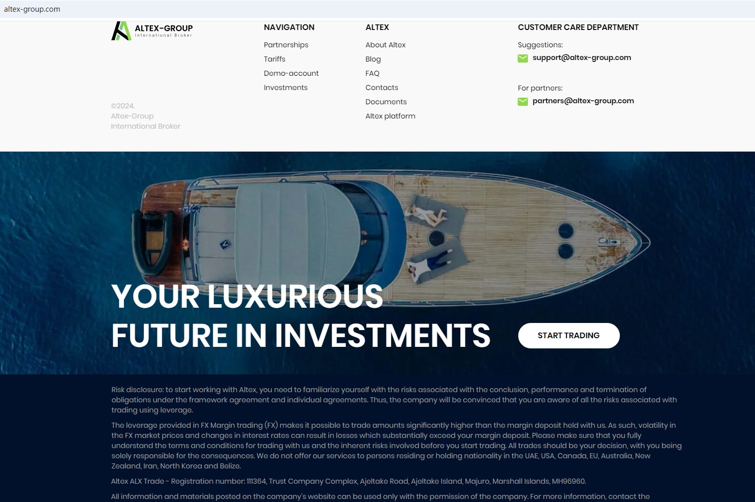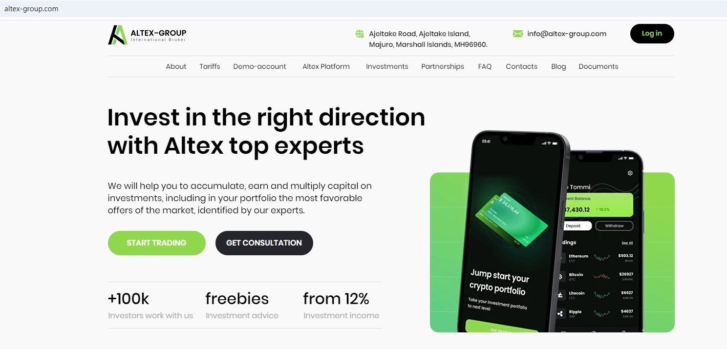 Altex Group claims to be owned by Altex ALX Trade, is a reliable broker incorporated in Marshall Islands with registration number 111364, which offers a range of investment products to traders, including Cryptocurrencies, Stocks, ETFs, Metals, Securities, Currencies and more instruments for trading in global markets.