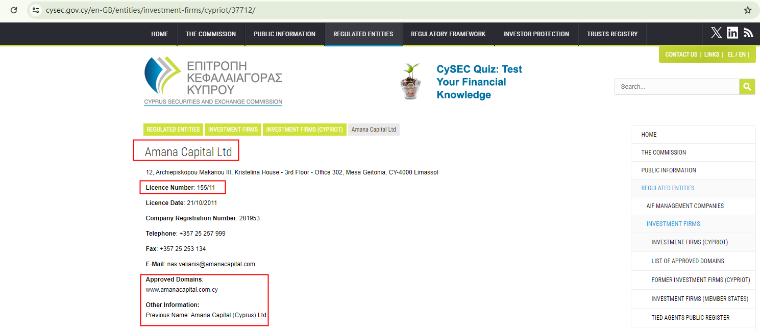 However, the license is, in fact, associated with Amana Capital Ltd, which has its own brand name and domains. Profiles provided by the CySEC don't support any affiliation between these two entities. AMACAP appears to be a case of identity theft, misusing details of a legitimate counterpart to dupe investors.