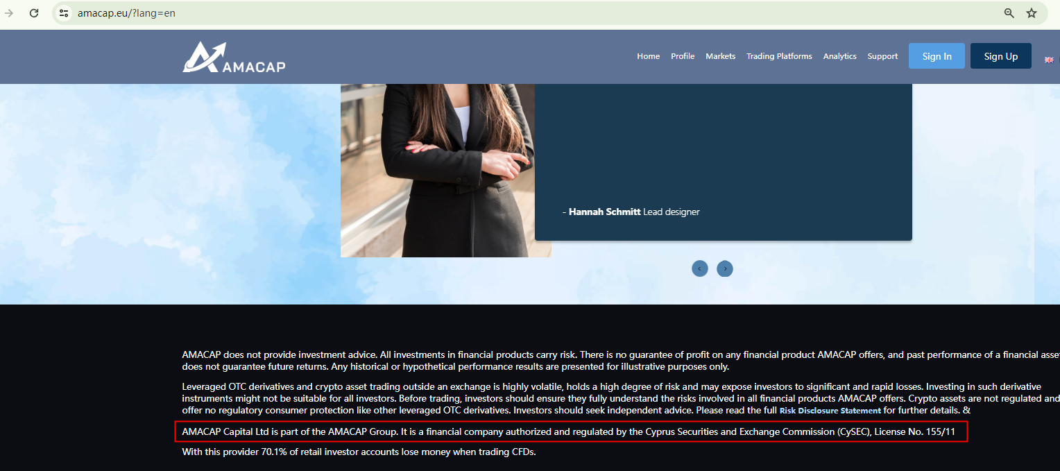 AMACAP claims to be operated by AMACAP Capital Ltd, a company supposedly authorized and regulated by the Cyprus Securities and Exchange Commission (CySEC), with License No. 155/11.