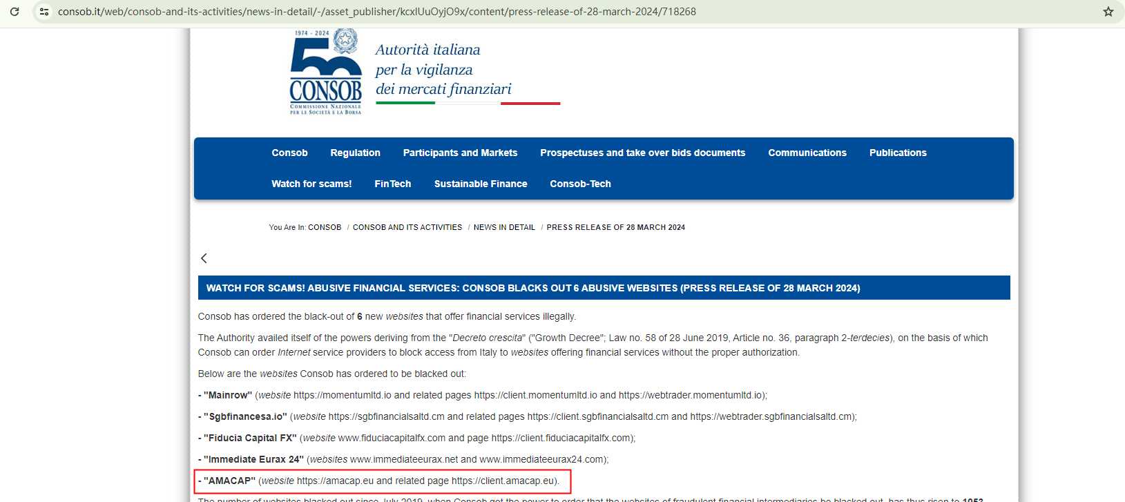 On March 28, 2024, the Italian Companies and Exchange Commission (CONSOB) ordered AMACAP's website to be blacked out since it offers financial services illegally in Italy. https://www.consob.it/web/consob-and-its-activities/news-in-detail/-/asset_publisher/kcxlUuOyjO9x/content/press-release-of-28-march-2024/718268