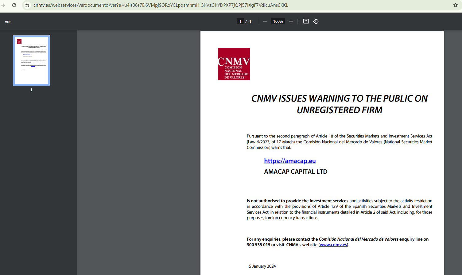 What's more, the Comisión Nacional del Mercado de Valores (CNMV) has added AMACAP to its warning list for providing investment services without authorization.