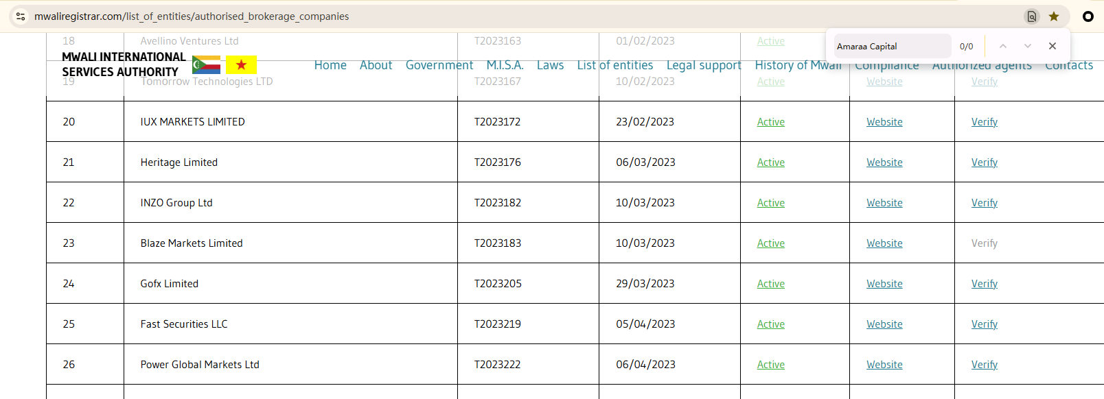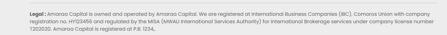Amaraa Capital claims to be regulated by the Mwali International Services Authority (MISA) in the Union of the Comoros, citing a company number “HY123456” and a licence number “T202020.” However, these identifiers are incomplete and do not correspond to any valid registration in MISA’s official records.
