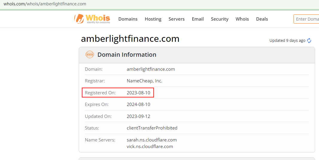 However, its domain, amberlightfinance.com, was first registered in August 2023. Investors should exercise extreme caution when encountering a website that is only three months old but boasts over ten years of experience.
