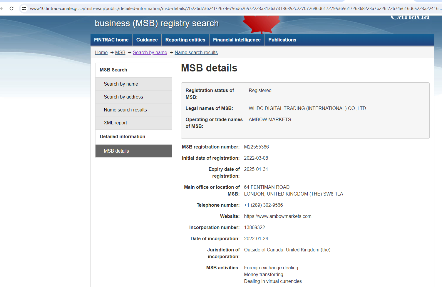 Ambow Markets claims to be authorised and regulated by the Financial Transactions and Reports Analysis Centre of Canada (FINTRAC), we searched the FINTRAC and found a matching result.