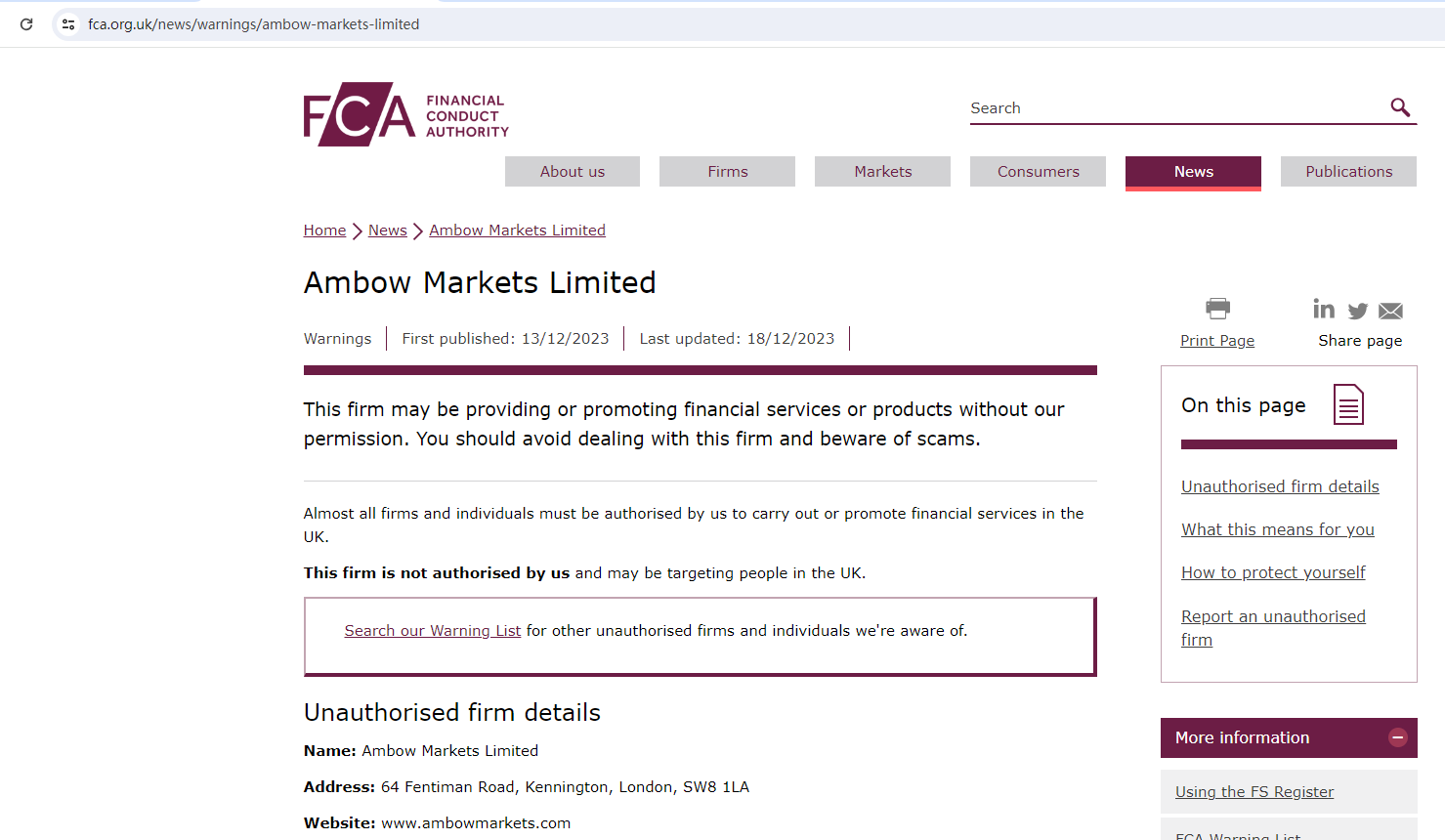 On 18 December 2023, the United Kingdom Financial Conduct Authority (UK FCA) issued a warning that Ambow Markets was providing financial services or products in the UK without authorisation. You may visit: https://www.fca.org.uk/news/warnings/ambow-markets-limited