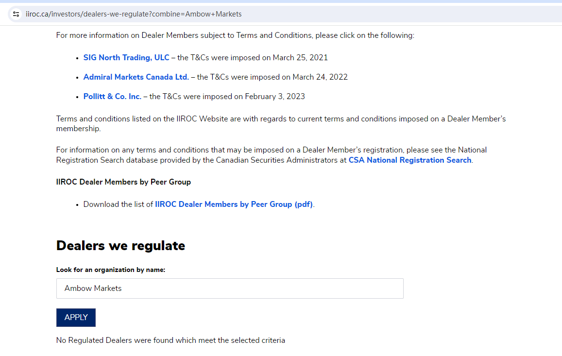 However, FINTRAC does not regulate forex brokers or issue forex licenses, so having registration does not mean being authorized to provide financial services. To operate as this type of broker in Canada, a company must be regulated by the Investment Industry Regulatory Organization of Canada (IIROC), but our search for Ambow Markets in the IIROC register didn't yield any results.