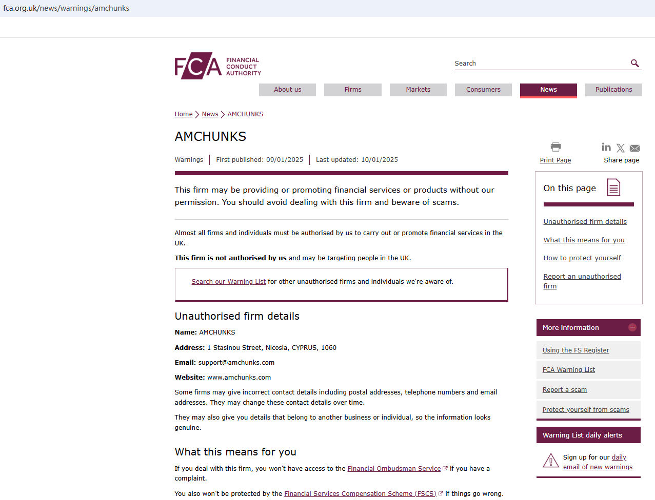 In addition, the Financial Conduct Authority (FCA) issued a warning against AMCHUNKS, believing this company might be providing financial services or products without proper authorization in the UK.