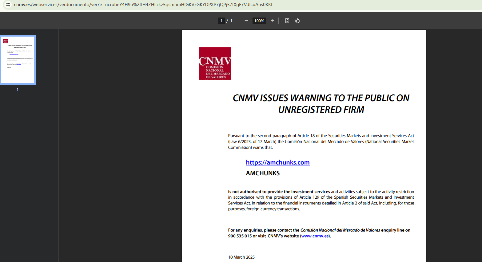 On March 10, 2025, the Comisión Nacional del Mercado de Valores (CNMV) has added AMCHUNKS to its warning list for providing investment services without authorization. https://www.cnmv.es/portal/ResultadoBusqueda?tipo=1&nombre=amchunks