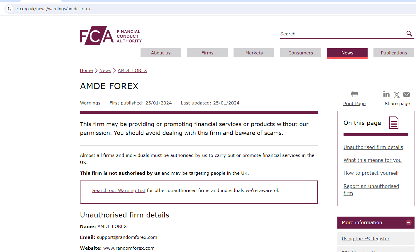 Moreover, the Financial Conduct Authority (FCA) has issued a warning about AMDE Forex, categorizing it as an unauthorized firm in the UK.