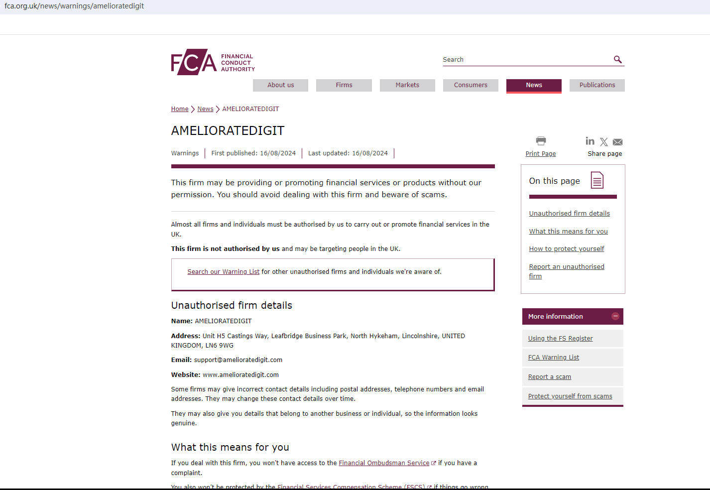 In addition, the Financial Conduct Authority (FCA) issued a warning against AMELIORATEDIGIT believing this company might be providing financial services or products without proper authorization in the UK.
