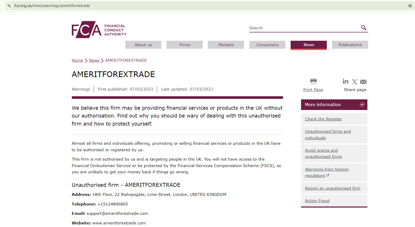 In addition, the Financial Conduct Authority (FCA) has flagged AMERITFOREXTRADE as an unauthorized firm in the UK.