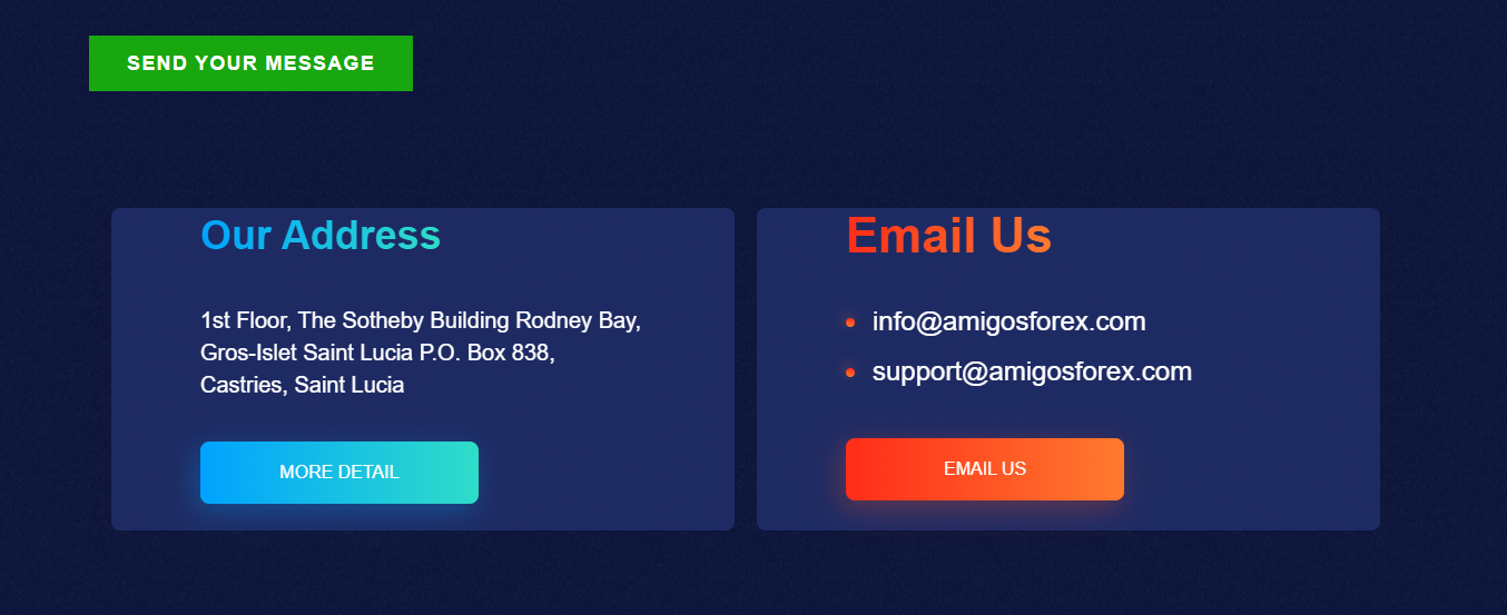 Amigos Forex displays no licensing information, and even its legal entity name is not disclosed. The website only states that it is registered in Saint Lucia. However, when we searched the official registry of the Saint Lucia International Financial Centre (IFC), we found no record of a company named Amigos Forex. Furthermore, it’s important to note that the IFC only grants International Business Company (IBC) status, which is not equivalent to a financial license, and there is no financial regulatory body in Saint Lucia that oversees such services. Therefore, Amigos Forex is not licensed by any regulator and appears to be a scam.