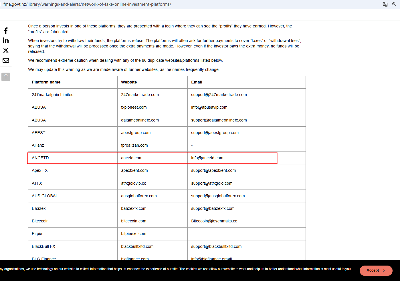 On 17 February, 2025, the New Zealand Financial Markets Authority (NZ FMA) issued a warning against ANCETD, suspecting that it is involved in a scam. https://www.fma.govt.nz/library/warnings-and-alerts/network-of-fake-online-investment-platforms/