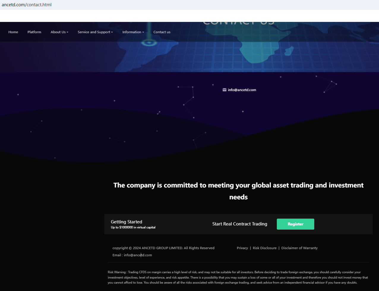 BrokersView found that the domain "https://ancetd.com/contact.html" is currently inaccessible. This is widely regarded as a significant red flag, as the suspension of a broker's website often points to underlying regulatory or operational issues.