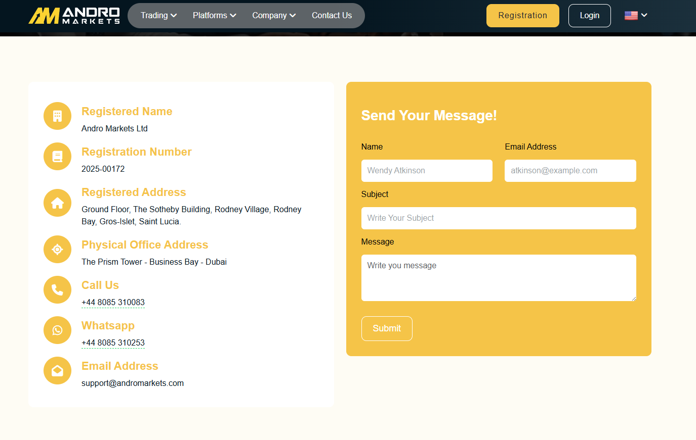 AndroMarkets claims to operate under the name Andro Markets Ltd, registered in Saint Lucia, and maintains a physical presence in Dubai.