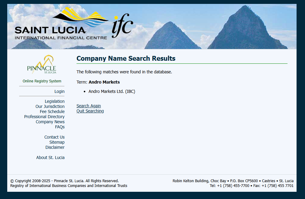 First, while its registration with the Saint Lucia International Financial Centre (IFC) could be found, this only grants it International Business Company (IBC) status, which is not a valid financial services license.