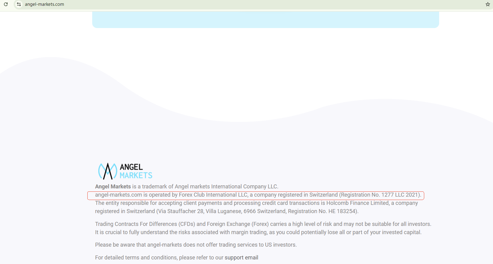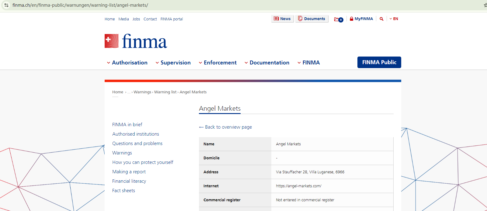 Angel Markets appears to have emerged recently, with its domain registered at the end of July 2024. While Angel Markets claims to be operated by Forex Club International LLC, allegedly registered in Switzerland, the registration number it provides aligns with the format used by the Financial Services Authority of Saint Vincent and the Grenadines (SVG FSA). This inconsistency is a significant red flag. Additionally, the Swiss Financial Market Supervisory Authority (FINMA) has flagged Angel Markets as an unregistered entity in Switzerland.