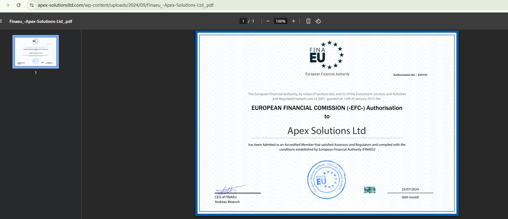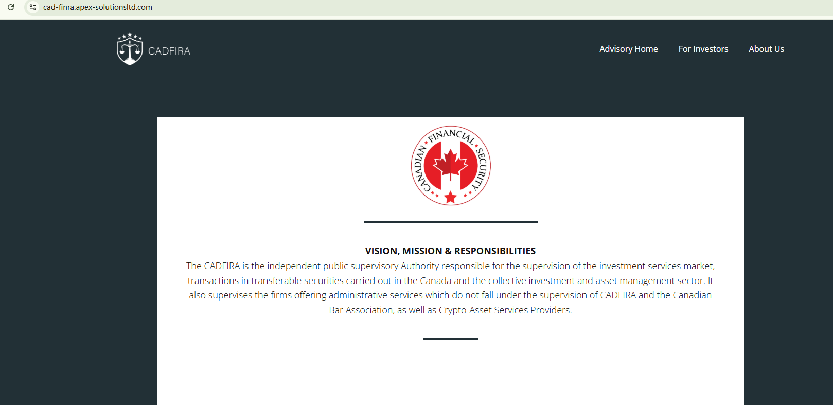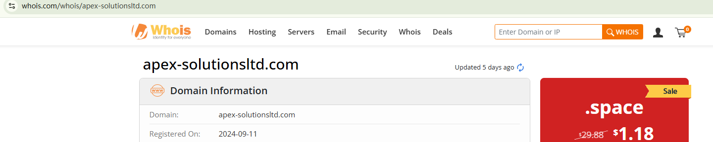 The domain name was registered in September 2024, a recent registration that serves as a warning sign. Apex Solutions Ltd claims to be regulated by two fake regulatory authorities, FINAEU and CADFIRA, which have been repeatedly warned by financial regulators. In addition, the Financial Conduct Authority (FCA) has issued a warning about Apex Solutions Ltd operating in the UK without the required authorization.