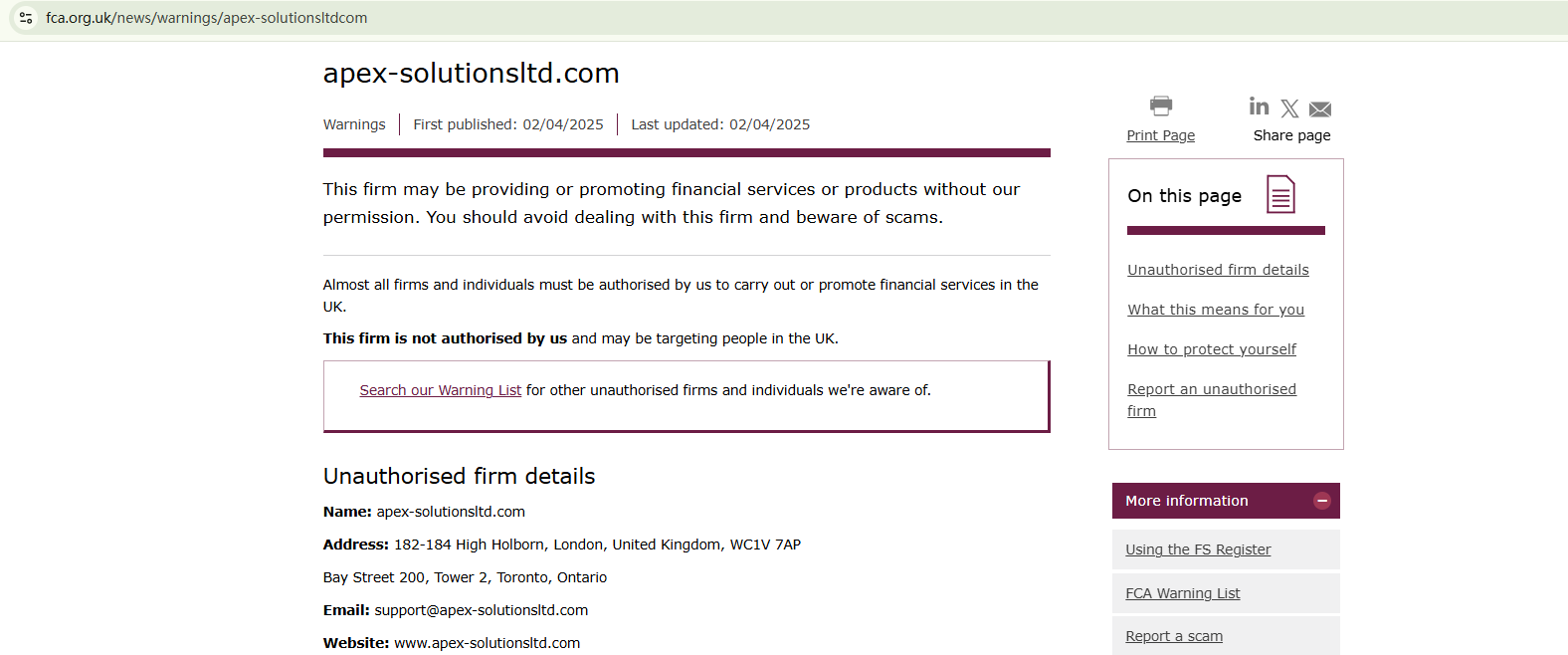 On April 2nd, 2025, the Financial Conduct Authority (FCA) issued a warning against Apex Solutions Ltd, believing this company might be providing financial services or products without proper authorization in the UK. https://www.fca.org.uk/news/warnings/apex-solutionsltdcom