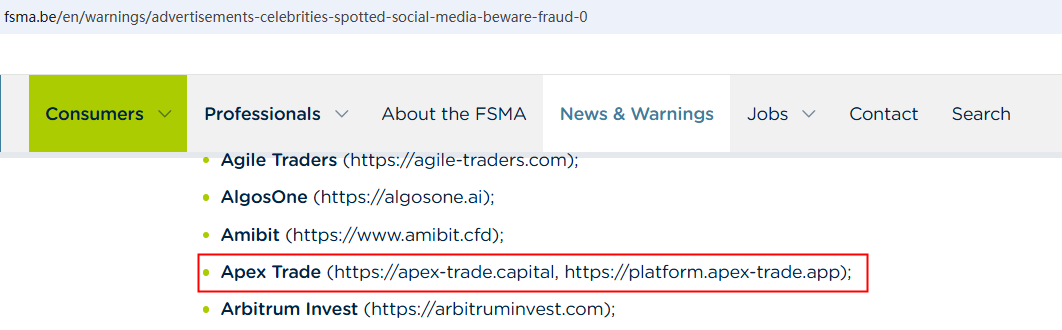 On March 19, 2025, the Financial Services and Markets Authority (FSMA) issued a warning about Apex Trade for the lack of the required authorization. https://www.fsma.be/en/warnings/advertisements-celebrities-spotted-social-media-beware-fraud-0