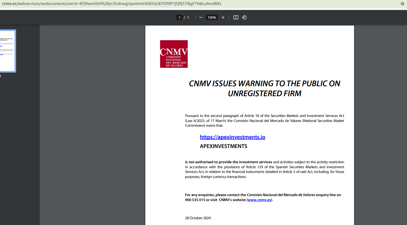 On October 28, 2024, the Comisión Nacional del Mercado de Valores (CNMV) has added APEXINVESTMENTS to its warning list for providing investment services without authorization. https://www.cnmv.es/portal/ResultadoBusqueda.aspx?tipo=1&nombre=APEXINVESTMENTS