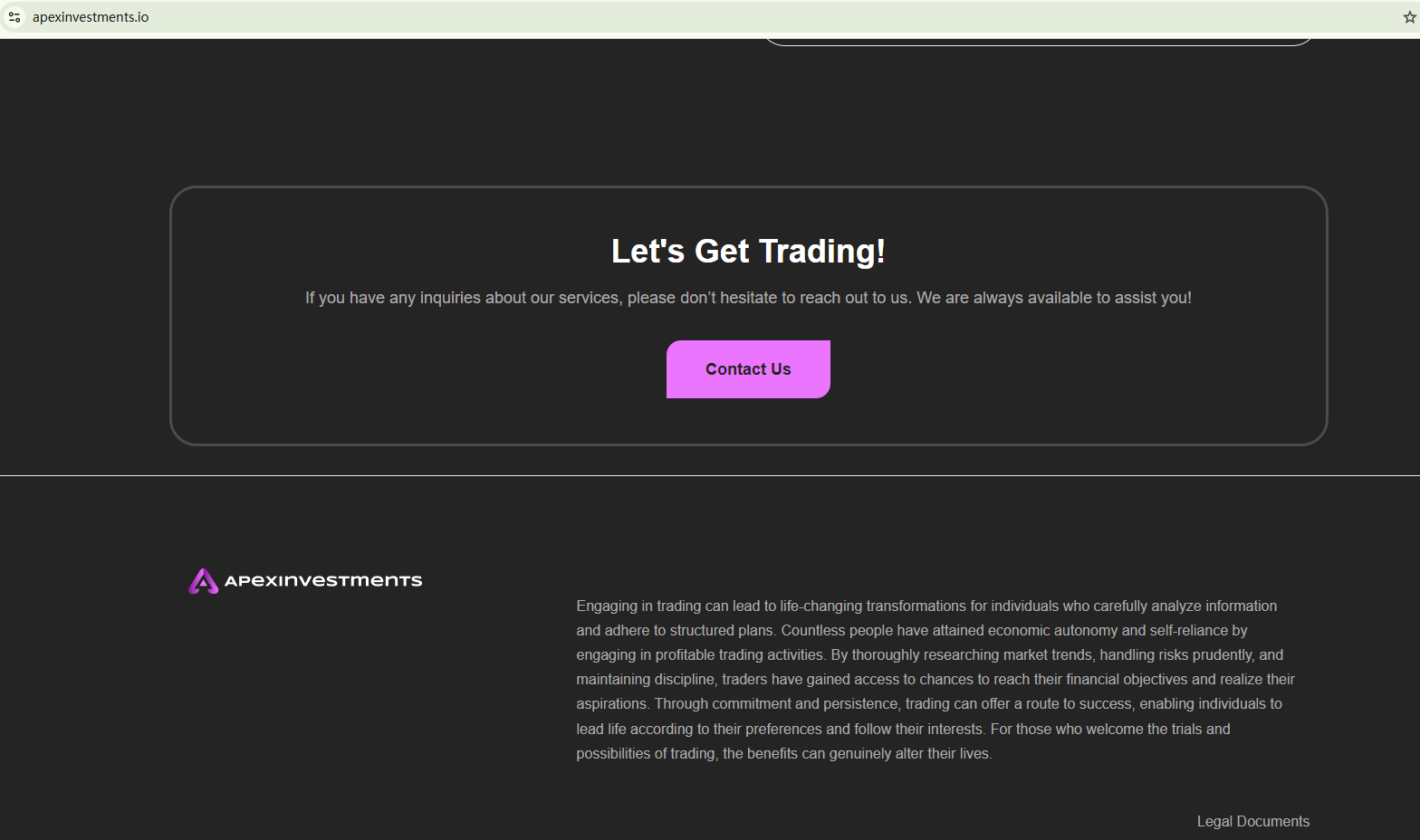 BrokersView found that the domain "https://apexinvestments.io/" is currently inaccessible. This is widely regarded as a significant red flag, as the suspension of a broker's website often points to underlying regulatory or operational issues.
